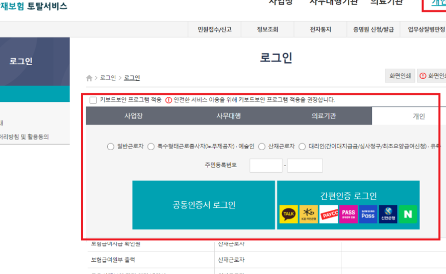 근로복지공단 토털서비스에서 일용 내역서 출력