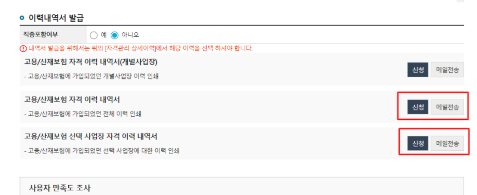 아래로 가시면 개별 사업장/전체/선택 중에서 본인이 원하시는 이력내역서를 신청하시고 출력하시면 모두 끝나게 됩니다.