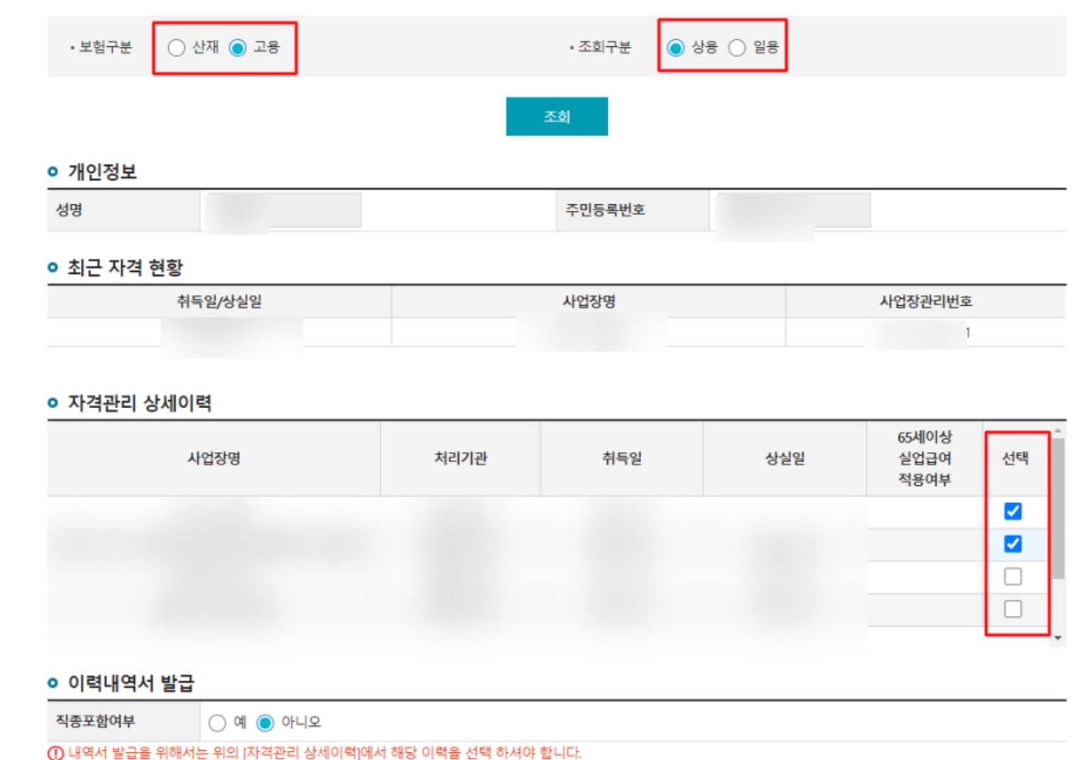 아래로 가시면 개별 사업장/전체/선택 중에서 본인이 원하시는 이력내역서를 신청하시고 출력하시면 모두 끝나게 됩니다.