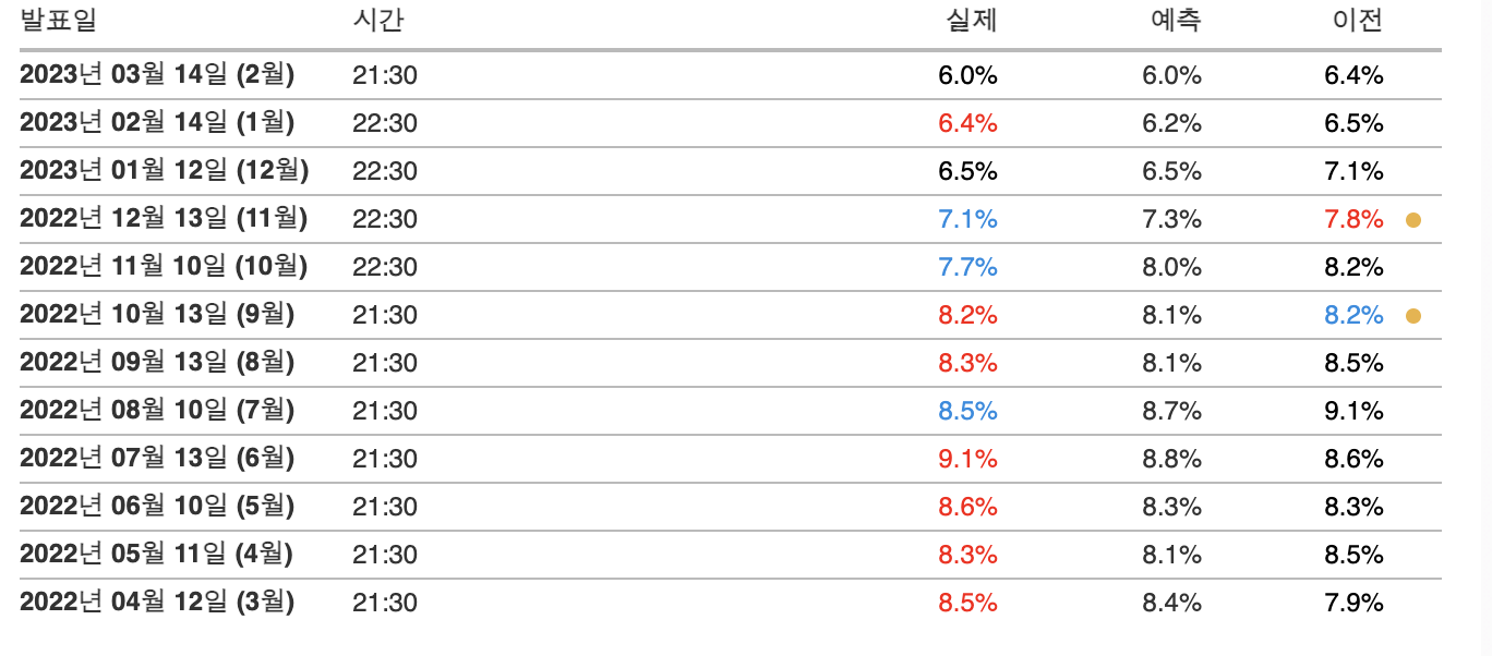시장의 예상치인 6.0% 상승과 같고 2월 CPI는 전월치 6.4%에서도 상승세가 느려지고 있습니다. 그리고 근원 CPI 경우에도 지난해 같은 기간보다 5.5% 올랐고 2월 근원 CPI는 전월치인 5.6%에서 조금 둔화하는 모습을 보였네요.