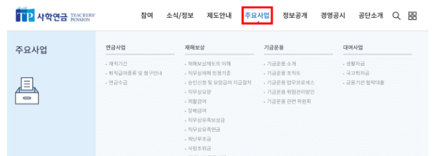 상단 메뉴에서 본업을 클릭하면 연금사업, 재해보상, 기금운용 등에 대한 정보를 알아볼 수도 있습니다.