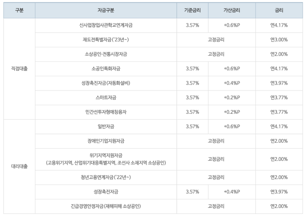 | 성장촉진자금 | 직접대출) 경력 3년 이상이며 자동화설비 도입하여 운영중이거나 도입하고자 하는 소상인 | |