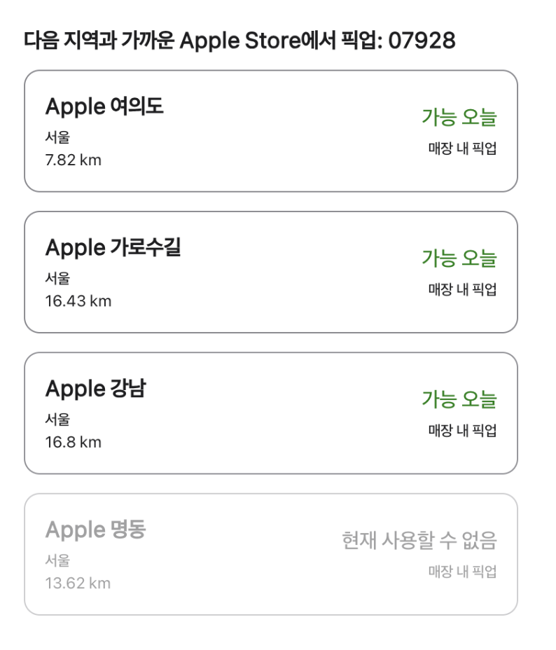 아래 그림과 같이 본인 주소에서 가장 가까운 오프라인 매장기준으로 픽업가능한 매장 정보를 바로 알아 보실수 있습니다.