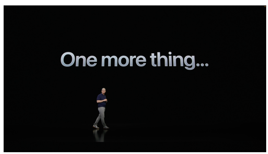 키노트가 1시간 30분이 지나가는데 역시 새로운 제품은 없구나 하는 순간 우리 큰 형님 팀국이 나오면서 분위기가 변하기 시작했습니다. 'One more thing...'이라는 문구와 함께 나의 심장은 미친 듯이 뛰었네요 ㅎㅎㅎ 애플은 다른 제품 회사랑 다른 게 그 설렘이 있습니다. 저만 그런 것일 수도 있는,,, 애플 제품만 사용해서 그런가요??