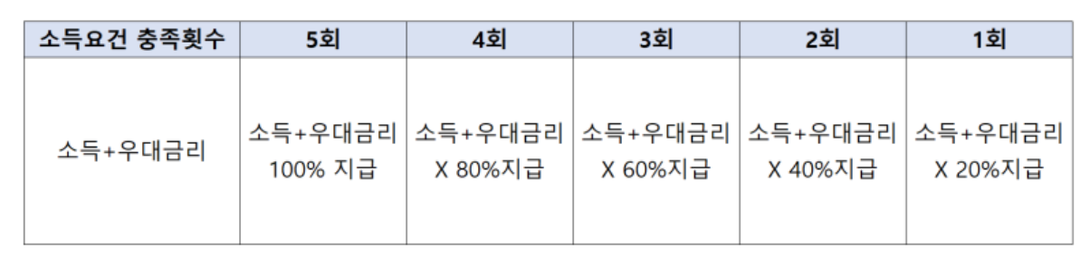 - 소득우대 : 모든 은행들이 동일하게 0.5% (소득우대는 가입 후 1년을 주기로 심하한 개인금액의 요건 충족 횟수에 따라 우대금리가 차등 지급되다고 합니다.
