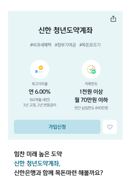 본인이 주로 사용하고 계신 주거래 은행에서 신청하시는 게 빨로고 쉬울 수 있습니다. 은행 어플로 오전 9시부터 오후 6시 반까지 비대면 신청이 가능하고 만 19~34세까지 가입할 수 있는 연령입니다. 그리고 병역을 이행한 사람이면 최대 6년을 연령계산에서 빠지는 장점이 있습니다.