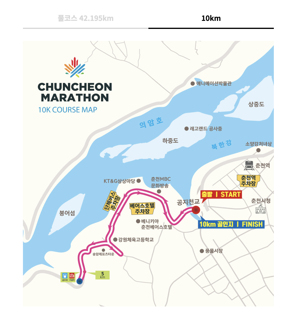 코스안내: 풀코스: 춘천시청 - 석사교 - 의암댐 - 춘천시청 10km: 춘천시청 - 석사교 - 의암댐 - 춘천시청