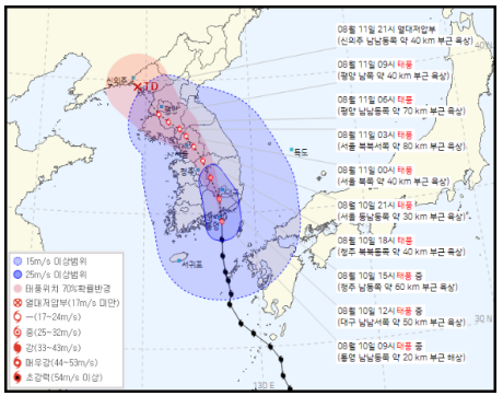 10일 제주를 제외한 전국에 태풍특보가 발효가 되었고, 강원 영동과 경북권을 중심으로 시간당 30~60mm의 매우 강한 비가, 그 밖의 지역에는 시간당 10~30mm의 많은 비가 내리는 곳이 있다고 합니다.