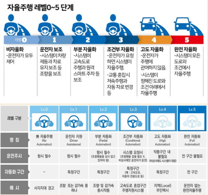 | 레벨 4 : 고도 자동화 | 고속도로 및 일반 도로에서도 자율주행이 가능하나, 운전자가 전방 및 운전대를 주시해야 함 |