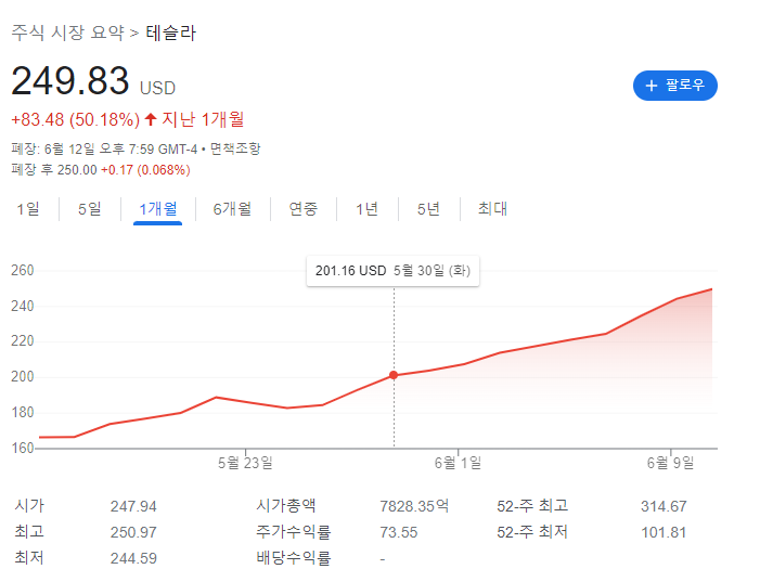 테슬라는 전날 보다 2.22% 상승한 $249.83달러를 기록했다.