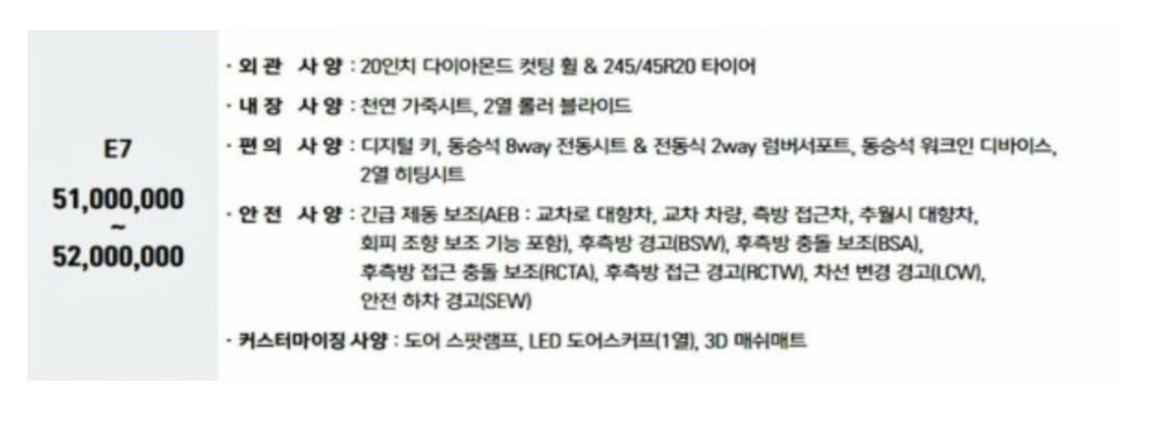 기존 T5 트림에서 선택적으로 제공되던 다양한 기능들이 기본으로 제공되며, 최대 55만 원의 가격 인하가 이루어집니다. 또한, T7 등급에서는 동승석 파워시트, 도어스커프, 추가 스마트 키, 3D 매쉬매트, 인포콘 무상 서비스 등이 기본 옵션으로 포함되며, 가격은 기존과 동일하게 유지될 예정입니다.