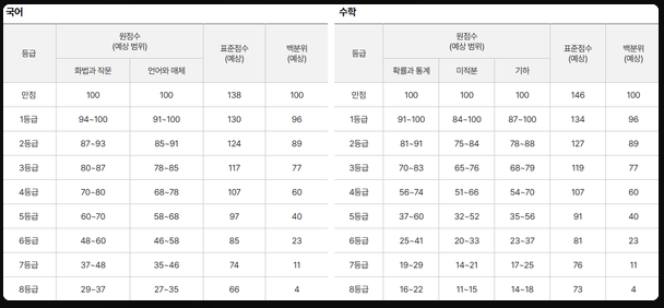| 1등급 | 130 | 93~94(화법과 작문, 91~92(언어와 매체) |