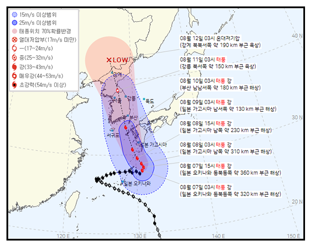 이렇게 흘러가면 6호 태풍 카눈은 8월 5일에 중국 상하이 남쪽으로 상륙할 것으로 예상했는데 기상처에서 7월 31일 오전 10시에 발표한 자료에 의하면 오전 9시 일본 오키나와 남동쪽 660km 해상을 지나 복서진 하다기 8월 3~5일에 오키나와 서쪽 혹은 상하이 남동쪽 해상에서 대한민국으로 방향을 돌릴 것으로 예상이 바뀌었습니다.