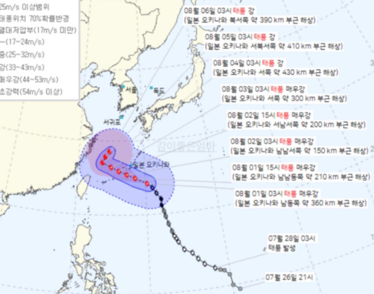 이렇게 흘러가면 6호 태풍 카눈은 8월 5일에 중국 상하이 남쪽으로 상륙할 것으로 예상했는데 기상처에서 7월 31일 오전 10시에 발표한 자료에 의하면 오전 9시 일본 오키나와 남동쪽 660km 해상을 지나 복서진 하다기 8월 3~5일에 오키나와 서쪽 혹은 상하이 남동쪽 해상에서 대한민국으로 방향을 돌릴 것으로 예상이 바뀌었습니다.